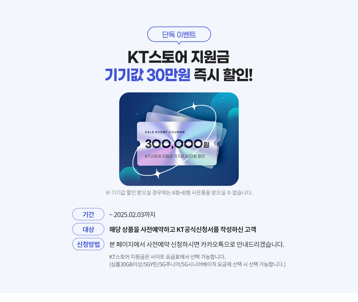 ● 할인 쿠폰 : KT 스토어에서 사전예약 시 사용할 수 있는 300,000원의 할인 쿠폰이 제공됩니다. 이 쿠폰은 특정 제품에만 유효하므로, 자세한 사항은 KT 스토어 웹사이트를 확인하시기 바랍니다.