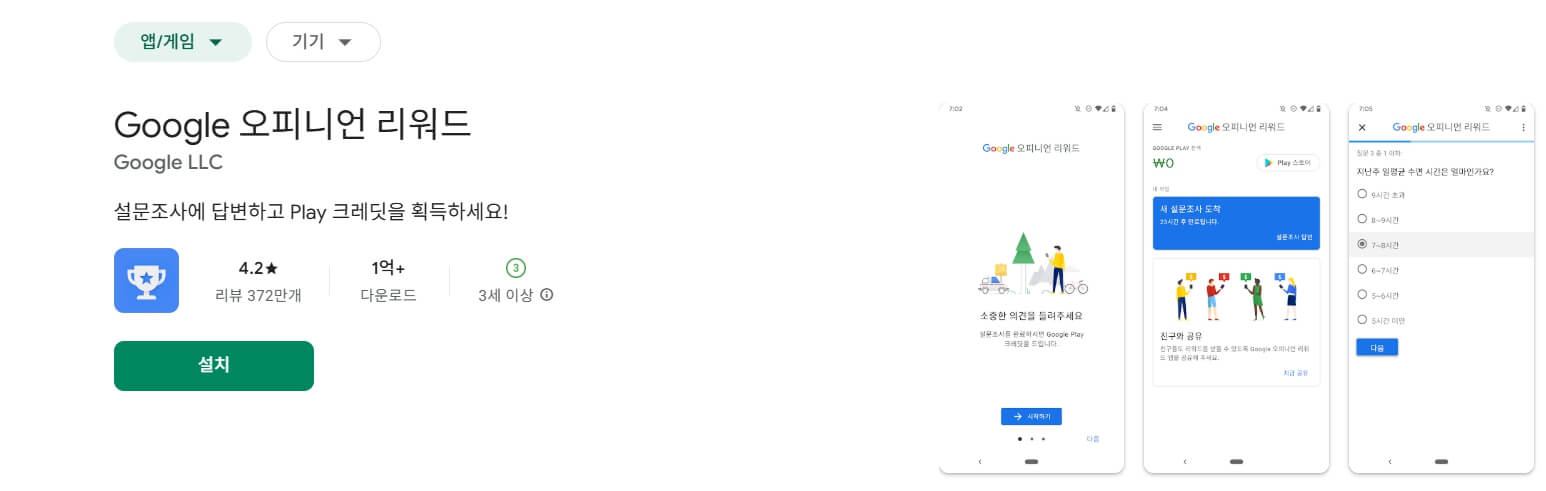 설문에 답변하면 Google Play 크레딧 또는 PayPal 현금으로 바로 전환 가능합니다. 1건당 100~1,000원 수준으로 빠르게 적립되는 것이 특징입니다.