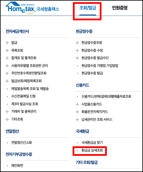 2. 환급금 조회 선택 : 메뉴에서 ‘조회/발급’ > ‘국세환급’ > ‘국세환급금 찾기’를 선택합니다.