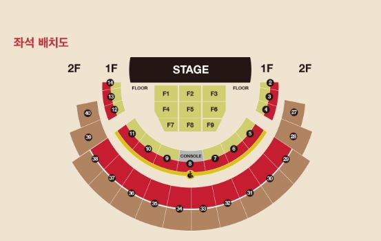 좌석 배치도는 중앙 무대를 기준으로 F1부터 F9까지의 플로어 좌석과 1F, 2F의 일반 좌석으로 나뉘어 있습니다. 관람 시에는 무대와의 거리, 시야 등을 고려하여 좌석을 선택하는 것이 중요합니다.